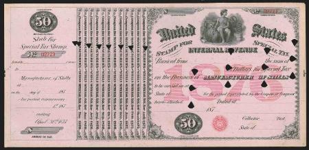 Manufacturer of Stills 1876 $50 black & red on pink, punched remainder, VF
