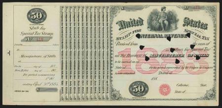 Manufacturer of Stills 1883 $50 black & red (pale green) punched remainder, VF