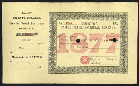 One Still 1877 $20 black & red (yellow), punched remainder, VF
