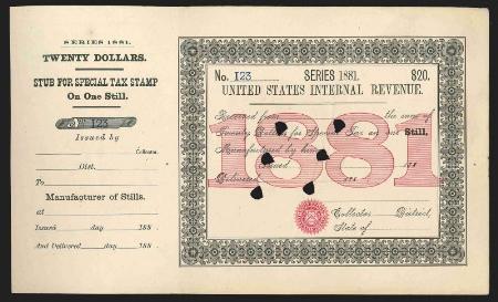 One Still 1881 $20 black & red, punched remainder, VF