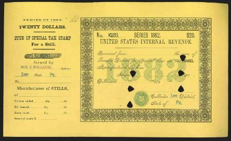 One Still 1882 $20 black & blue (yellow), punched remainder, VF