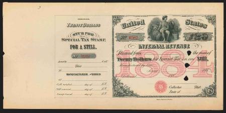 One Still 1884 $20 black & red, punched remainder, VF