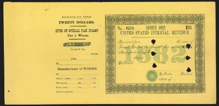 One Worm 1882 $20 black & blue (yellow) punched remainder, VF