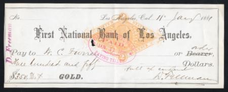 Scott RN-G1. Los Angeles, California. First National Bank of Los Angeles, D. Freeman bank check. 1881. Black on white. Gold. Used, VF