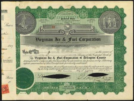 Virginian Ice & Fuel Corporation of Arlington County stock certificate. 1927