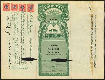Virginian Ice & Fuel Corporation of Arlington County stock certificate. 1927. Cancelled, F-VF