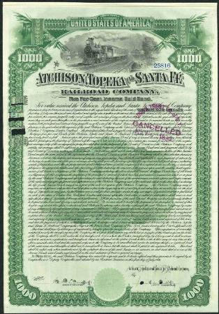 Atchison, Topeka and Santa Fe Railroad Company $1000 5% Income Gold Bond. 1889. Franklin Bank Note Co. New York imprint.  Cancelled, VF