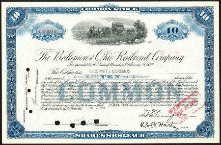 Baltimore and Ohio Railroad Co. common stock certificate, 10 shares. 1958. International Bank Note Co. New York imprint. Old train vignette. Cancelled, VF