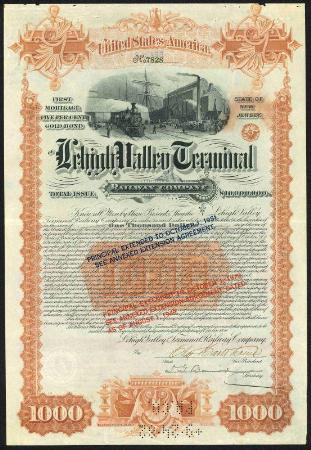 Lehigh Valley Terminal Railway Company $1000 First Mortgage 5% Gold Bond. New Jersey. 1891.