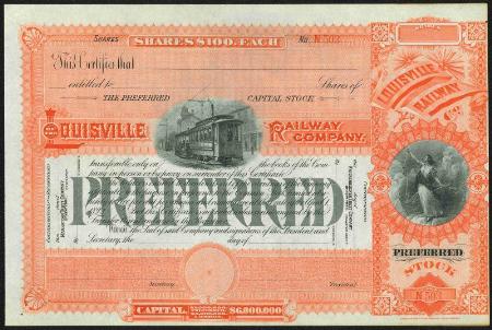 Louisville Railway Company preferred stock certificate. Louisville, Kentucky.