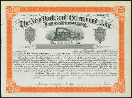 The New York and Greenwood Lake Railway Company stock certificate. New Jersey. 18__.