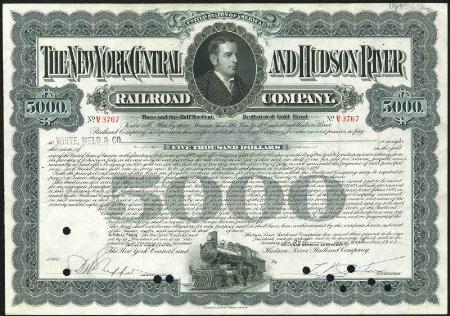 New York Central and Hudson River Railroad Company $5,000 3 1/2% Registered Gold Bond. 1923. American Bank Note Company, New York imprint. Train vignette. Cancelled, VF