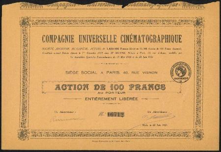 FRANCE Compagnie Universelle Cinematographique stock certificate. Paris. 1921.