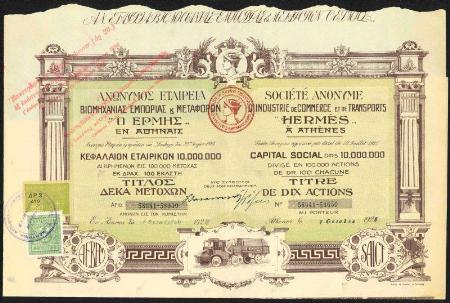 Societe Anonyme D'Industrie de Commerce et de Transports Hermes a Athens stock certificate. Athens. 1925. Greece revenue stamp affixed. Issued, VF