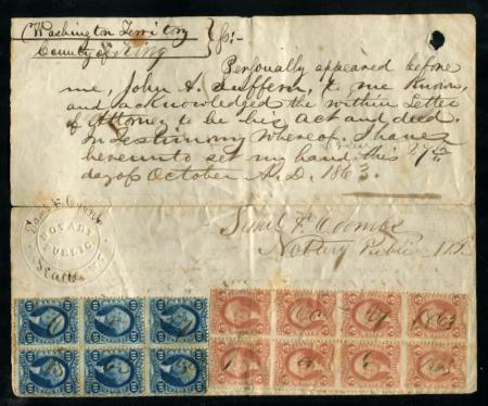 block of eight (2x4) and R32c block of six (2x3) on a portion of a document notarized in King County, Washington Territory. 1863. Fine, small faults