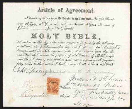 Article of Agreement regarding purchase of and payment plan for a book entitled HOLY BIBLE. Cold Spring, New York. 1868. Stamp with freak perfs at left. F-VF