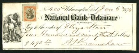National Bank of Delaware bank check. Wilmington, Delaware. 1874. Farmer and horse. Used, VF