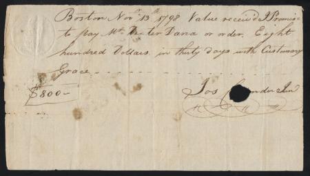 Promissory note. Boston, Massachusetts. 1798. Sharp strike, light fold affects stamp, VF small hole in signature to cancel note