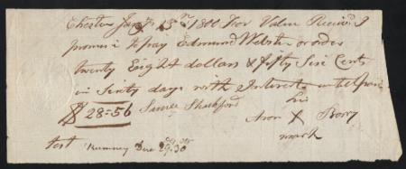 Promissory note. Chester, New Hampshire. 1800. Sharp strike, file fold affects stamp, VF
