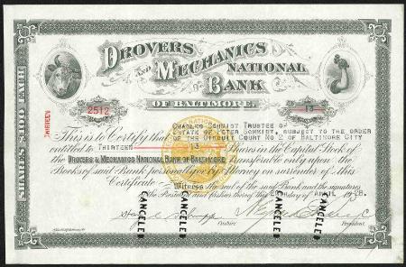 Drovers and Mechanics National Bank of Baltimore stock certificate. Baltimore, Maryland. 1928.