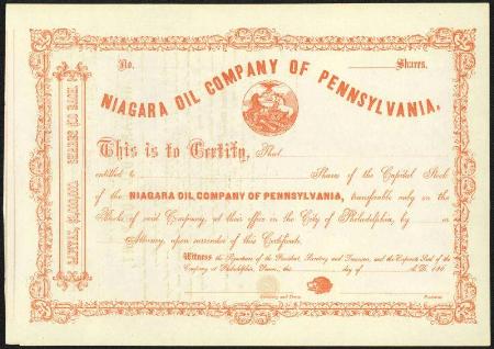 Niagara Oil Company of Pennsylvania stock certificate. Philadelphia, Pennsylvania. 186_. Unissued, VF