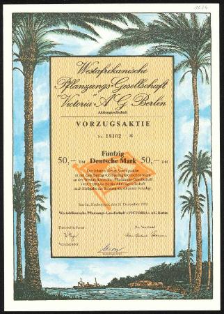 GERMANY Westafrikanische Pflanzungs Gesellschaft Victoria AG Berlin preferred stock certificate. Berlin. 1989
