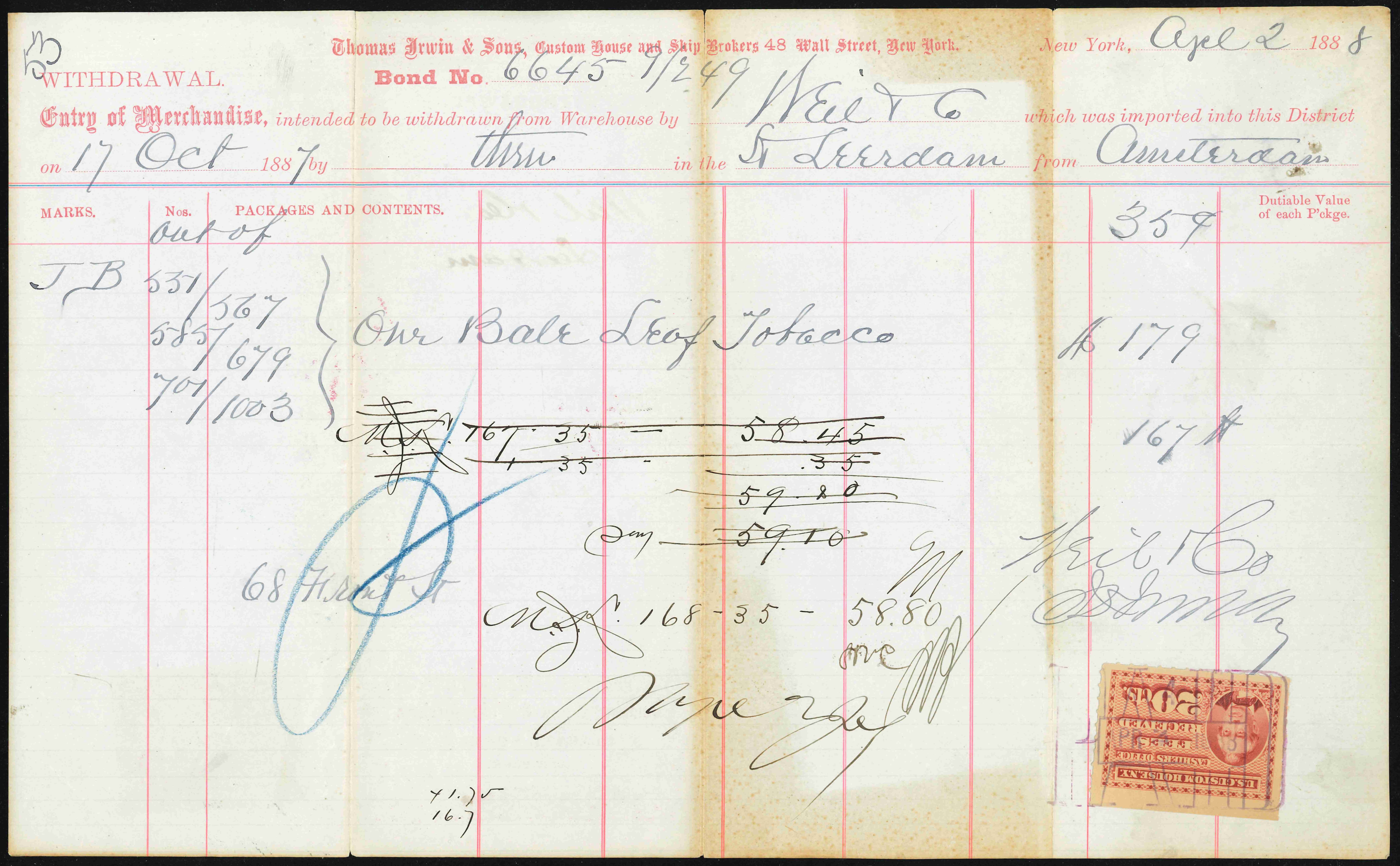 Scott RL1 1887 20c dull red (Silas Wright) Thomas Irwin & Sons, Custom House and Ship Brokers, Withdrawl Entry of Merchandise. New York, N.Y.. 1888. Stamp tied by purple h/s. VF some foxing on face of document