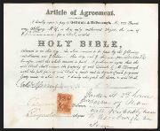 | 4 |  | | | Scott R24c 1862-71 5c Certificate, red Article of Agreement regarding purchase of and payment plan for a book entitled HOLY BIBLE. Cold Spring, New York. 1868. Stamp with freak perfs at left. F-VF |