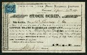 Little Miami Rail Road Shellabear-Tolman / Scott L-15B, R33c 1682-71 10c Certificate, blue black oval h/s ties stamp to a Stock Scrip certificate. Cincinnati, Ohio. 1870. Cancelled, VF