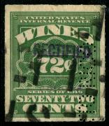 | Lot | | | Description | | 123 |  | | | Greenwald PR RERS28 1937 72c green violet sans-serif handstamp, perfin, VF light wrinkles |