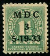 | 24 |  | | | M D C 3 5-19-33 (Mission Dry Corp.) Scott RE19 1914 1 1/2c green black printed cancel, F |