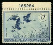 | Item Status  | | | | | 70 |  | | | Scott RW22 1955 $2 dark blue, Blue Geese top plate No. 165284 single, mint, NH, F-VF |