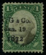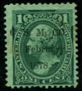 | | | Item Status  | | | | | 76 |  | | | C.S.M. CO. Scott RB11a 1875-81 1c green on silk C.S.M. CO. February 1878. black printed cancel, F-VF |