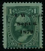 | | | Item Status  | | | | | 80 |  | | | C. Wakefield. Bloomington, Illinois Scott RB11b 1875-81 1c green on watermarked C W & CO. Sept 6 1879. black printed cancel, F tiny tone spot |