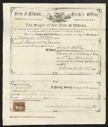 | 23 |  | | | Scott 76 1861-66 5c brown (Thomas Jefferson) marriage license and certificate. Adams Co., Illinois. 1866. Stamp is ms. cancelled. F-VF |