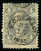 | | | Item Status  | | | | | 76 |  | | | J.P. Dinsmore & Co. New York Scott R22c 1862-71 4c Proprietary, purple black SON cds, F |