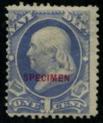 Scott O35S 1875 1c Navy Department, ultramarine (Benjamin Franklin)SPECIMEN red overprint, F few nibbed perfs