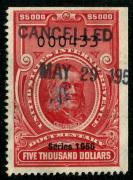 | Item Status  | | | | | 34 |  | | | Scott R704 1956 $5,000 carmine (C.J. Folger) Serial No. 000433, black handstamp and three tiny pinholes cancels, VF - |