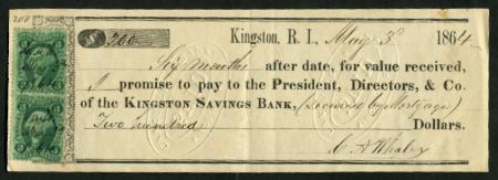 R16c two singles on a promissory note payable at the Kingston Savings Bank. Kingston, Rhode Island. 1864. F-VF