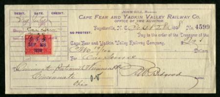 R164 Cape Fear and Yadkin Valley Railway Co. draft. Fayetteville, North Carolina. 1898. VF