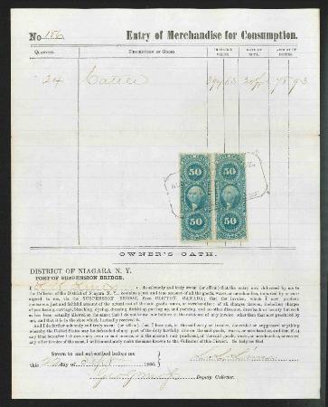 SUSPENSION BRIDGE Customs House, DISTRICT OF NIAGARA, R60c horizontal pair, black h/s on Entry of Merchandise for Consumption. Niagara, New York. 1866. F-VF s/e at right | Description |  | SUSPENSION BRIDGE Customs House, DISTRICT OF NIAGARA Scott R60c 1862-71 50c Original Process, blue horizontal pair, black h/s on Entry of Merchandise for Consumption. Niagara, New York. 1866. F-VF s/e at right |  | Click here for High Definition Images | Bidding |  |