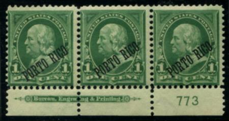 PR 210 bottom BEP imprint & plate No. 773 strip of three, mint, NH, F