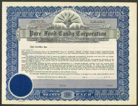 Pure Food Candy Corporation stock certificate. Massachusetts. 19__