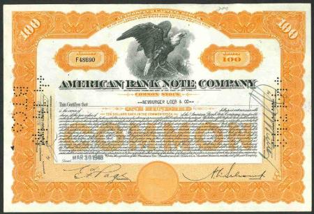 American Bank Note Company common stock certificate for 100 shares. 1948. American Bank Note Company imprint. Eagle vignette. Cancelled, VF
