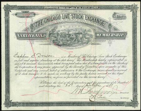 Chicago Live Stock Exchange membership certificate. Chicago, Illinois. 1890.