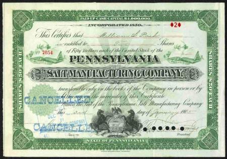 Pennsylvania Salt Manufacturing Company stock certificate. 1905. Cancelled, VF
