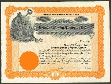 Roanoke Mining Company, Ltd. stock certficate. Idaho. 190_.