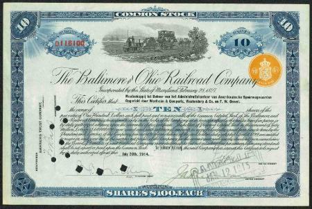 Baltimore and Ohio Railroad Co. common stock certificate, 10 shares. 1914. International Bank Note Co. New York imprint. Old train vignette. Netherlands embossed revenue stamp. Cancelled, VF