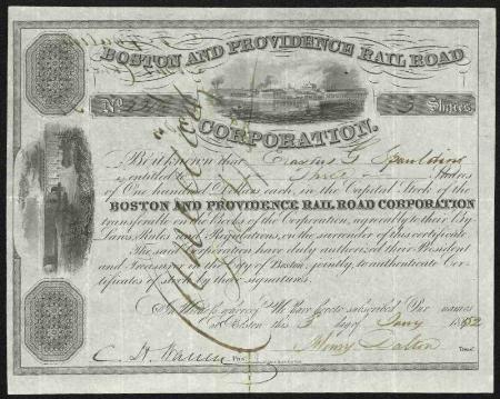 Boston & Providence Rail Road Corporation stock certificate. Boston, Massachusetts. 1852