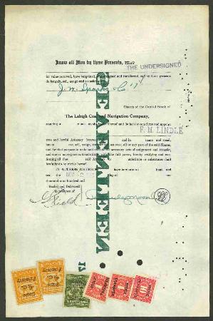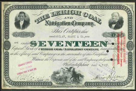 Lehigh Coal and Navigation Company stock certificate Philadelphia. 1928. American Bank Note Co. Phila. imprint. U.S. and Pennsylvania revenue stamps on verso. Cancelled, VF